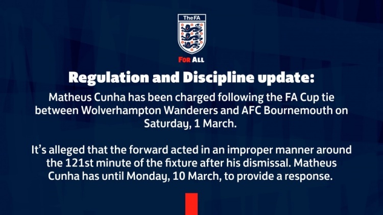 3月6日訊 英足總官方宣布,對狼隊前鋒庫尼亞提出指控。足總杯1/8決賽,狼隊120分鐘1-1,點球大戰4-5不敵伯恩茅斯。比賽最后時刻,裁判吹響加時賽結束哨音后,庫尼亞遭到伯恩茅斯后衛科爾克茲的拉拽,