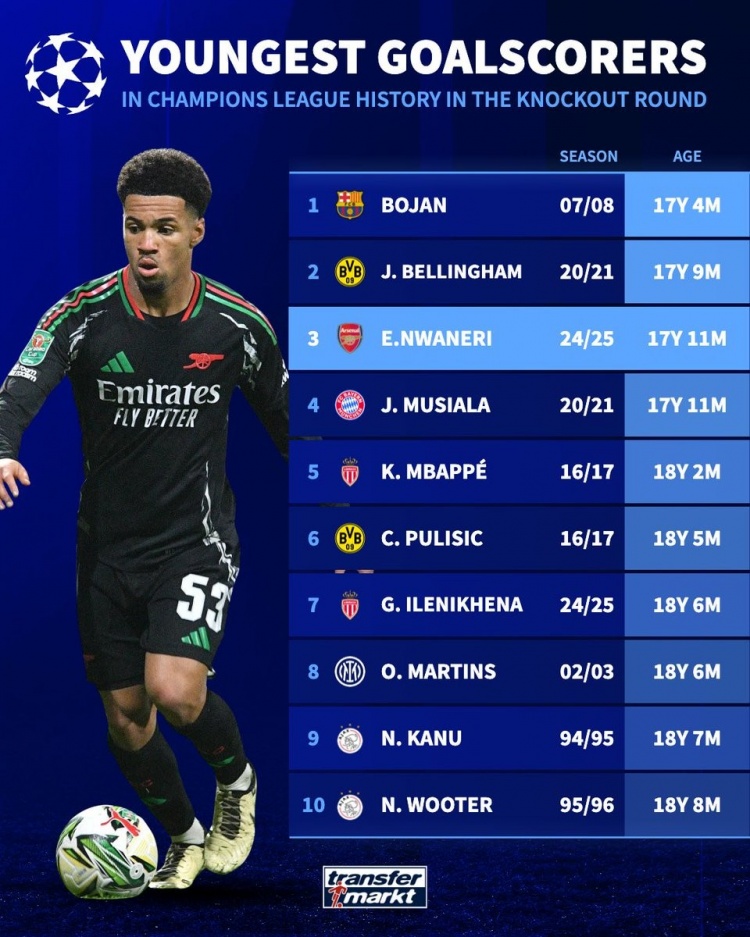 3月5日訊 阿森納在本輪歐冠淘汰賽客場7-1血洗埃因霍溫,小將恩瓦內(nèi)里破門,數(shù)據(jù)統(tǒng)計(jì)顯示他也是歷史第3年輕達(dá)成歐冠淘汰賽進(jìn)球的球員。德轉(zhuǎn)列歐冠淘汰賽最年輕進(jìn)球榜:1.博揚(yáng)(巴薩),17歲4月,07-0