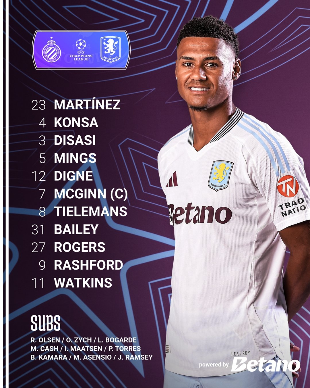拉師傅出戰歐冠淘汰賽!維拉vs布魯日:拉什福德、沃特金斯先發