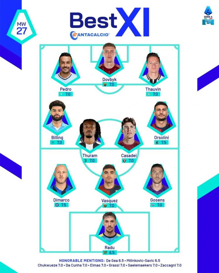 3月5日訊 意甲第27輪聯賽已經戰罷,意甲官方也評出了本輪聯賽最佳陣容,K-圖拉姆、迪馬爾科領銜。意甲第27輪官方最佳陣:前鋒:佩德羅(拉齊奧)、多夫比克(羅馬)、托萬(烏迪內斯)中場:比林(那不勒斯