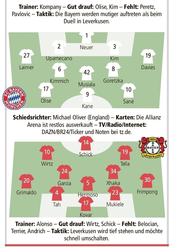 3月5日訊 本輪歐冠焦點戰,拜仁將坐鎮主場迎戰勒沃庫森,《慕尼黑日報》也預測了雙方首發陣容,基米希火線復出。拜仁慕尼黑:4231諾伊爾/萊默爾、于帕梅卡諾、金玟哉、戴維斯/基米希、格雷茨卡/奧利塞、穆