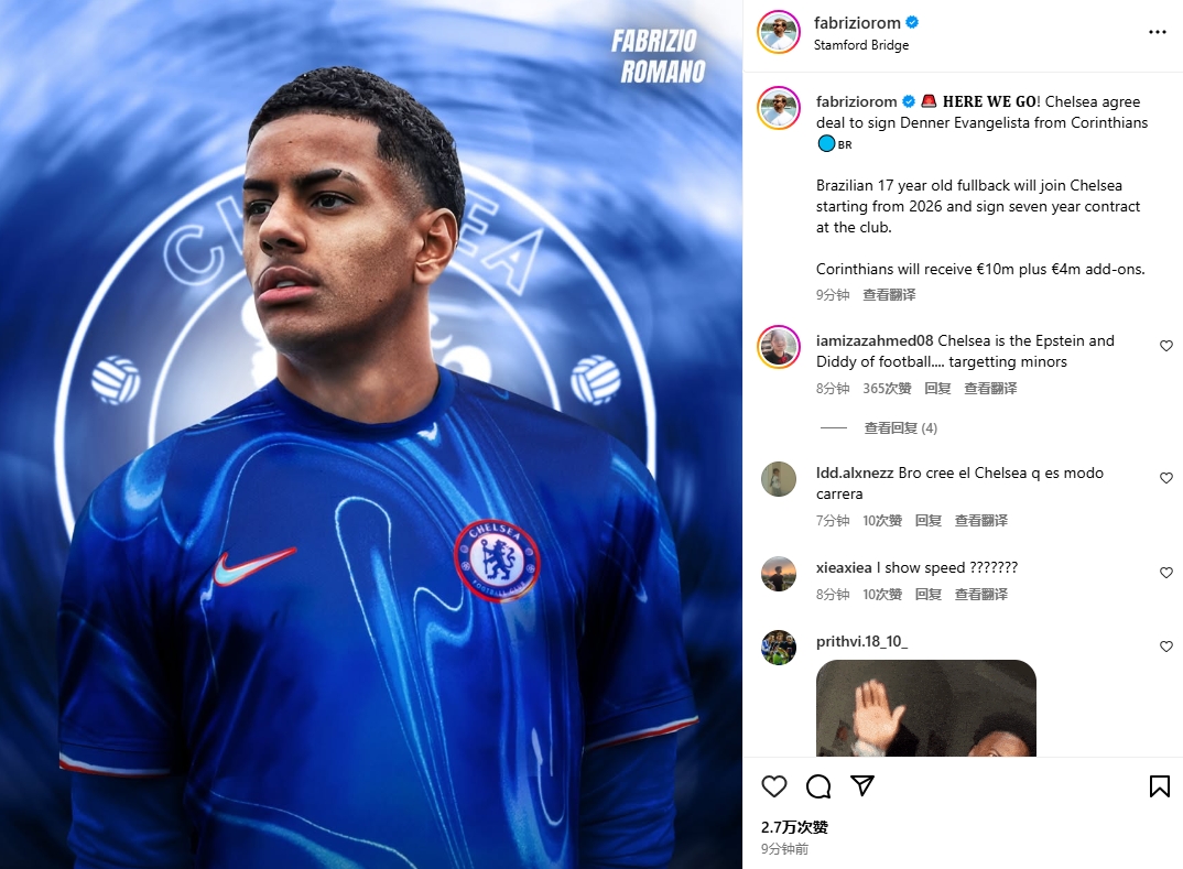 Here we go!羅馬諾:切爾西1400萬(wàn)簽17歲巴西后衛(wèi)登納,26年加盟