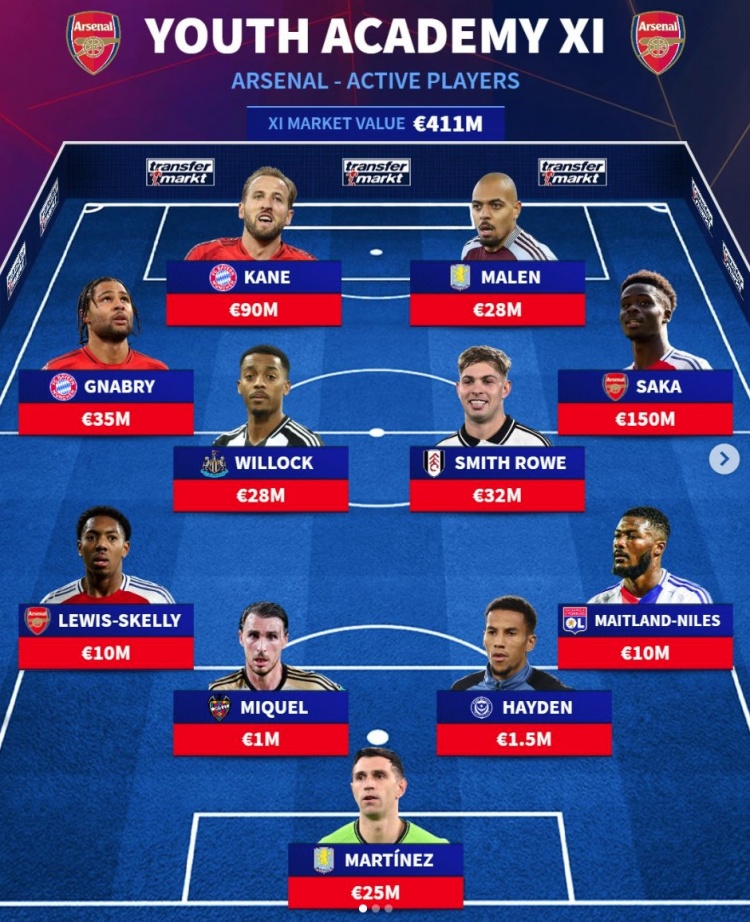 3月2日訊 《轉會市場》統計了阿森納、熱刺和切爾西三隊青訓出品的當前球員身價最貴陣,凱恩、薩卡、賴斯領銜。阿森納青訓當前最貴陣:總身價4.11億歐元前鋒:凱恩(拜仁,9000萬)、馬倫(維拉,2800