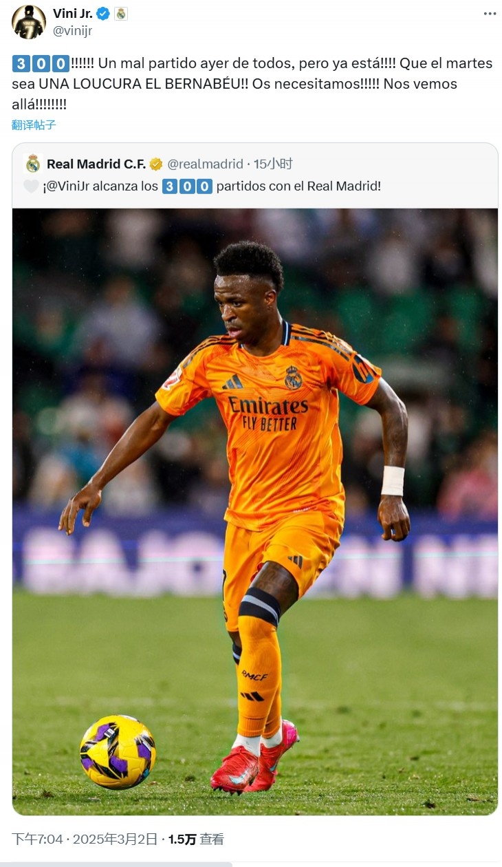 3月2日訊 巴西邊鋒維尼修斯在本輪西甲聯賽中迎來了自己的皇馬300場里程碑,不過球隊客場1-2負于貝蒂斯,賽后,維尼修斯在個人社媒上發布了動態。維尼修斯寫道:300稱里程碑!不過昨天是一場糟糕的比賽,