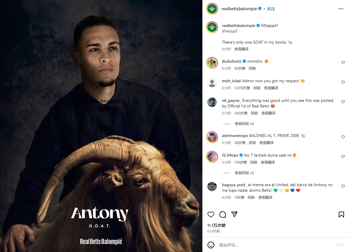 貝蒂斯官媒:姆巴佩?維尼修斯?我的字典里只有一位GOAT—安東尼