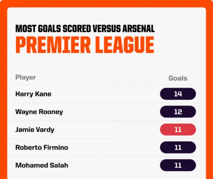 瓦爾迪英超對(duì)陣阿森納打進(jìn)11球歷史第三多,僅少于凱恩和魯尼