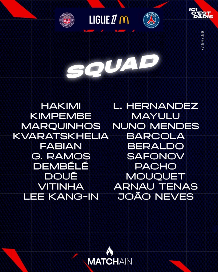 巴黎對陣圖盧茲名單:登貝萊、阿什拉夫、K77在列,多納魯馬缺席