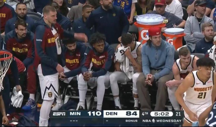 3月13日訊 NBA常規賽今天繼續進行,掘金在主場迎戰森林狼。三節結束時,掘金78比89落后。末節開始后,約基奇不休息,繼續打!第四節還剩10分33秒時,約基奇已經出戰32分鐘48秒,21投12中,三
