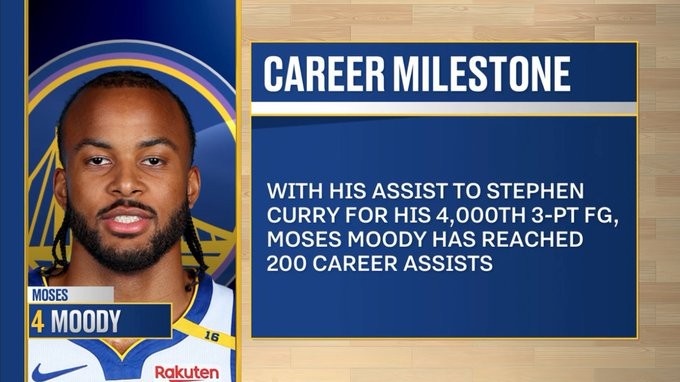 比賽第三節,穆迪助攻庫里命中本場第2記三分,后者正式突破4000記三分神級大關,而這也是穆迪生涯的第200次助攻!