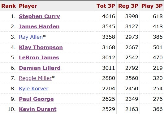 本場比賽過后,庫里生涯(常規賽+季后賽)的三分命中數來到4618記,距離5000記還有382記。