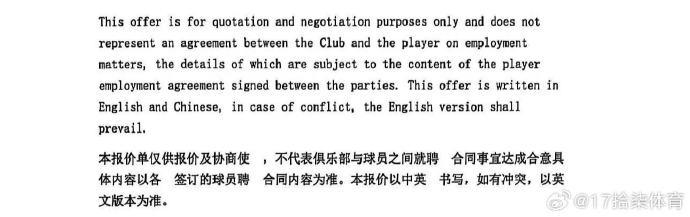 二 多家俱樂部對哈雷爾感興趣并進行了談判,其間另一家中方經紀公司在浙江稠州銀行俱樂部與哈雷爾的談判過程中簽訂了一份報價單,其中明確約定“該報價單僅供報價和協商使用,不代表球員與俱樂部完成聘用合同簽約。”——這也是浙江稠州銀行俱樂部多次公告中含糊其辭提及的“簽約”。最后,在多家俱樂部中談判協商中球員哈雷爾于二月十日選擇了簽約新疆廣匯俱樂部,三方按中國籃協和CBA公司要求簽訂了標準合同并在中國籃協完成了經紀人備案。