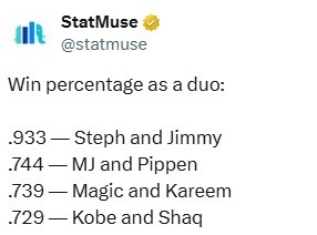 庫(kù)里+巴特勒勝率93.3%!美媒對(duì)比:?jiǎn)痰てづ?4.4% 科比鯊魚72.9%?