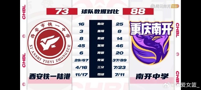 數據方面:南開中學胡馨月15分,汪子涵13分8助攻,王思琪12分12籃板6搶斷,谷滿杰11分9助攻7搶斷。西安鐵一陸港中學張賀玥19分5籃板,張桐菲18分6籃板,孫子喻11分5籃板。