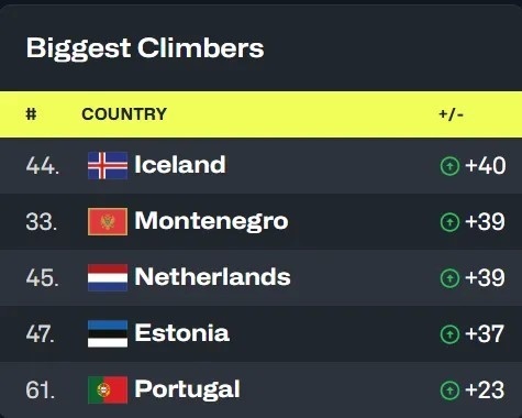 2023年9月,克羅地亞再掉五個名次,排名正式落到中國身后,他們在那個被新納入統計的窗口期合計輸給瑞典荷蘭烏克蘭55分,令人無語。