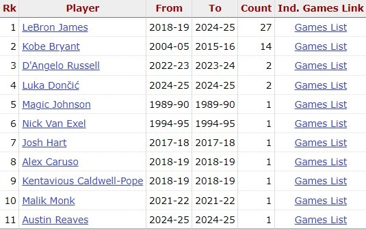 湖人隊史30+5+5+5三分場次:詹姆斯27 科比14 東契奇&拉塞爾2?