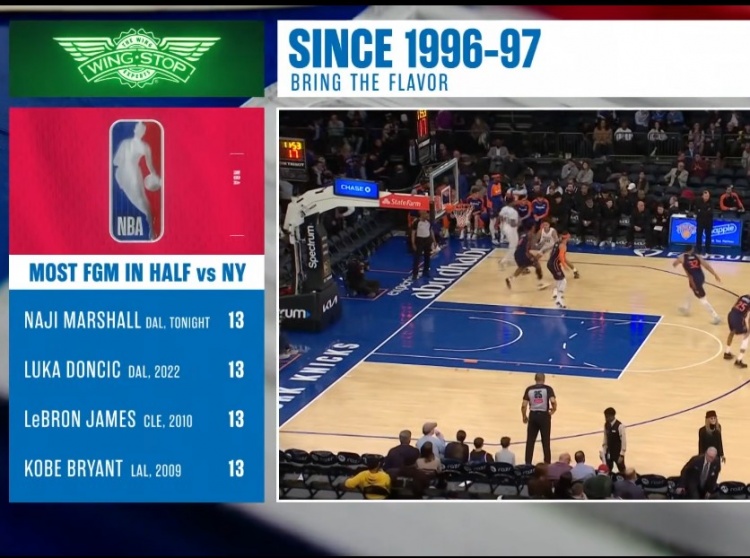 據統計,自1996-97賽季(有統計)以來,馬紹爾在對陣尼克斯的半場進了13球,追平了科比、詹姆斯和東契奇,并列第一。