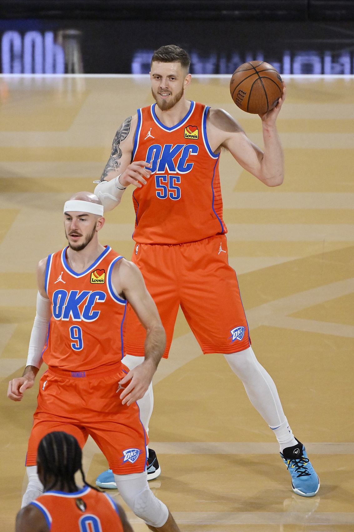 2023-24賽季,戴格諾特教練帶著25歲的亞歷山大、22歲的杰倫-威廉姆斯、21歲的霍姆格倫、24歲的多特、21歲的基迪、20歲的卡森-華萊士、21歲的杰林-威廉姆斯、24歲的以賽亞-喬、25歲的阿隆-維金斯、29歲的肯里奇-威廉姆斯更進(jìn)一步,他們進(jìn)攻效率第3、防守效率第4,常規(guī)賽豪取57勝25負(fù),登頂西部第一!
