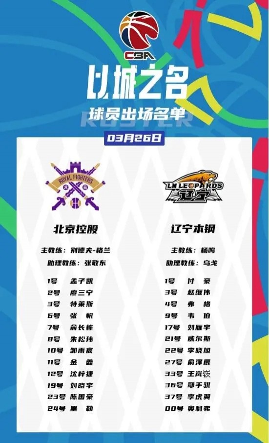 北控VS遼寧大名單:廖三寧趙繼偉領(lǐng)銜 弗格在列 韓德君張鎮(zhèn)麟缺陣