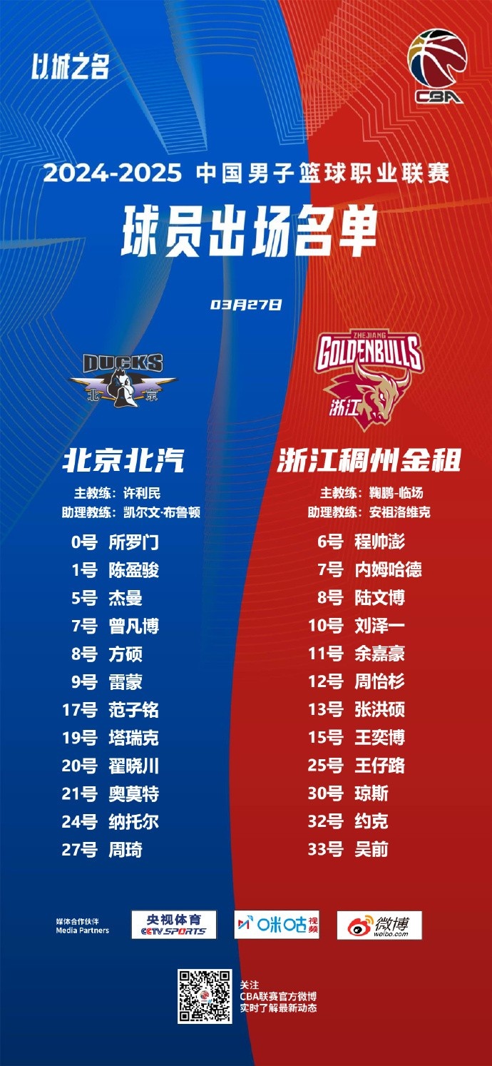 北京VS浙江大名單:周琦曾凡博吳前領銜 陳盈駿程帥澎在列