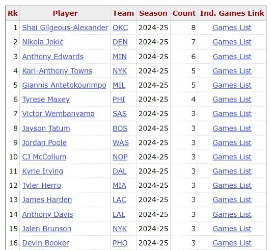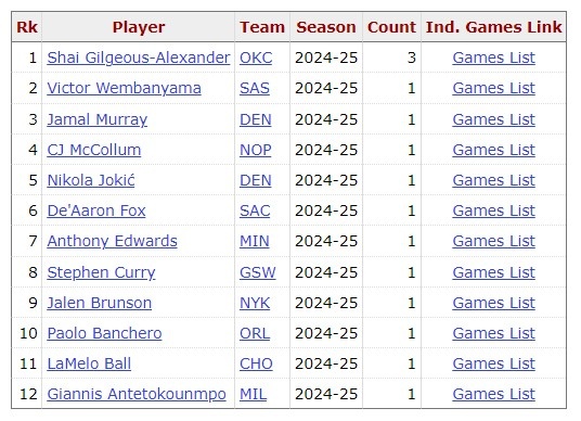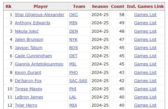根據數據統計,賽季至今,亞歷山大20+、30+、40+、50+場次以及場均得分(32.6分)都是聯盟第一。