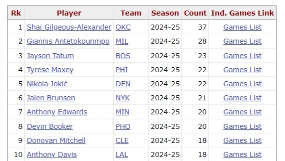 還有誰!賽季至今亞歷山大20+到50+場次都是聯盟第一?