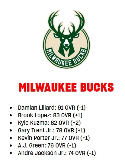 3月7日訊 NBA 2K官網(wǎng)更新了雄鹿球員的能力值情況,利拉德下降,庫茲馬等多人上調(diào),具體情況如下:
