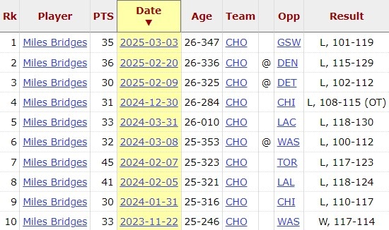 值得一提的是,邁爾斯-布里奇斯在過去10場(chǎng)拿到30+的比賽全輸了。