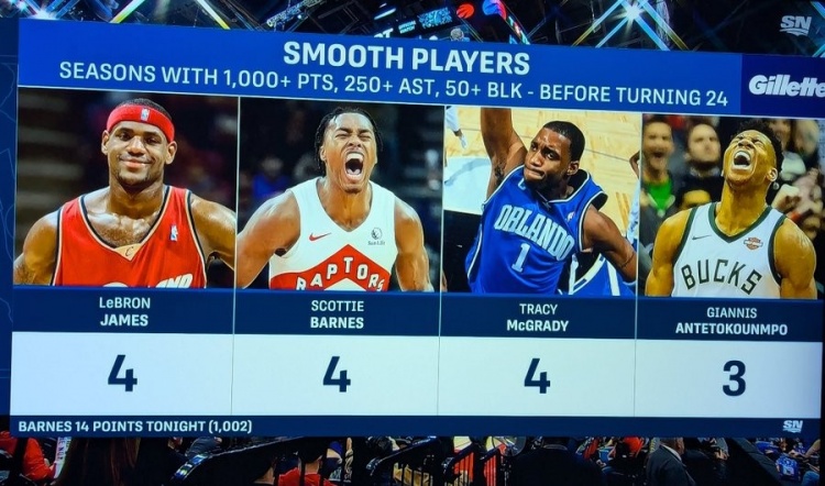 根據數據統計,加上本場比賽,斯科蒂-巴恩斯本賽季的得分已經突破1000分。生涯至今他已經4次做到單賽季得分1000+助攻250+蓋帽50+,他追平詹姆斯和麥迪,成為25歲前單賽季得分1000+助攻250+蓋帽50+次數最多的球員。