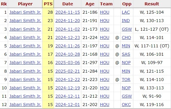 賈巴里-史密斯本賽季得分15+的比賽火箭12勝1負 只輸給勇士?