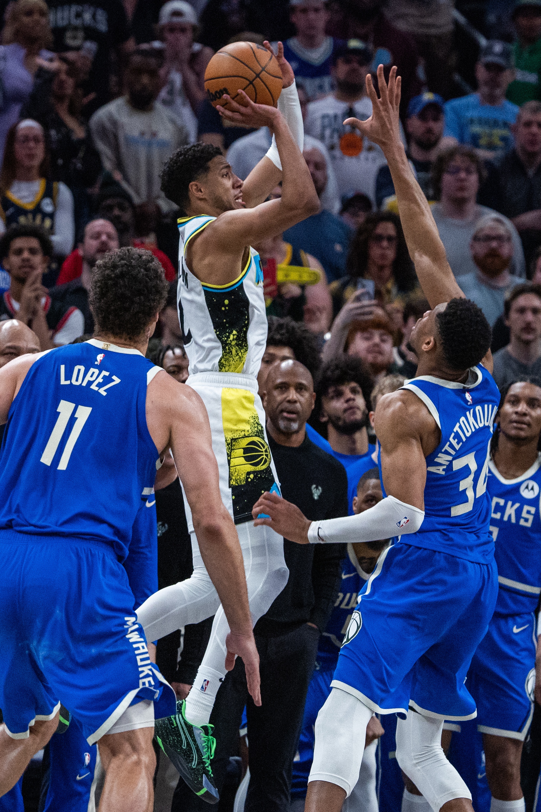 哈利伯頓在比賽最后時刻沿左側邊線切入,接手遞手邊線發球,面對字母哥的防守,在空中失衡的情況下命中后仰漂移三分,并且獲得了加罰。哈利伯頓罰球命中取得1分領先優勢后,只留下3.4秒,字母哥接球沖到前場三分不中,步行者取得比賽勝利。
