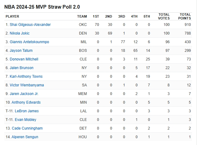 02月15日訊 在全明星間歇期到來之后,ESPN組織了100位記者、媒體人進行了賽季第二次MVP模擬投票,亞歷山大獲得了70張第一選票,高居榜首,約基奇拿到了30張第一選票,兩人包攬了所有的第一選票;字母哥票數總分排名第三,第四是塔圖姆,文班亞馬位居第七,詹姆斯和埃文-莫布里并列第11。