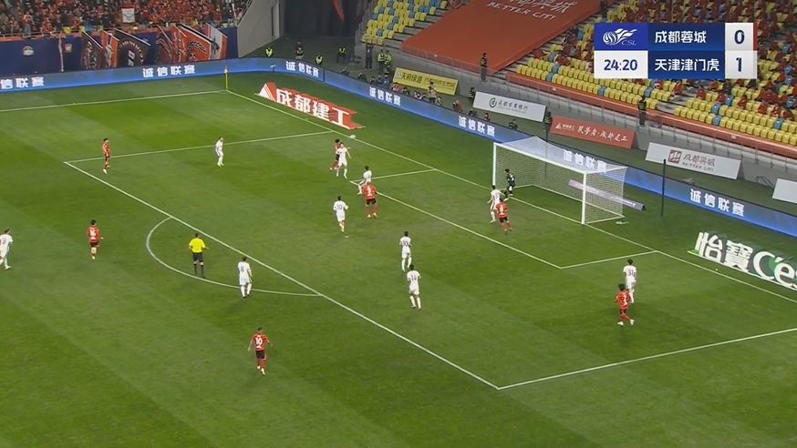 03月02日訊 中超第二輪,成都蓉城vs天津津門虎,比賽第25分鐘,胡荷韜精準傳中送助攻,韋世豪高難度頭球吊射破門,蓉城1-1扳平津門虎。