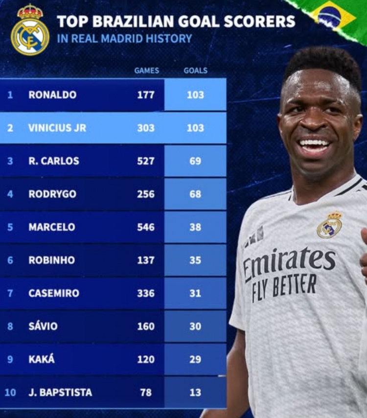 3月16日訊 《轉(zhuǎn)會(huì)市場(chǎng)》統(tǒng)計(jì)了皇馬歷史巴西球員進(jìn)球榜,大羅和維尼修斯均打進(jìn)103球并列最多。