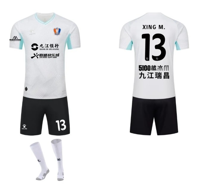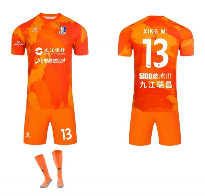 主場戰袍延續了江西廬山隊經典的橙色主色調,象征著激情、活力與勝利。球衣正面采用漸變設計,猶如長江之水奔流不息,寓意著江西足球生生不息,勇往直前。球衣背面印有“九江瑞昌”字樣,彰顯著球隊為江西、為九江、為瑞昌榮譽而戰的決心。