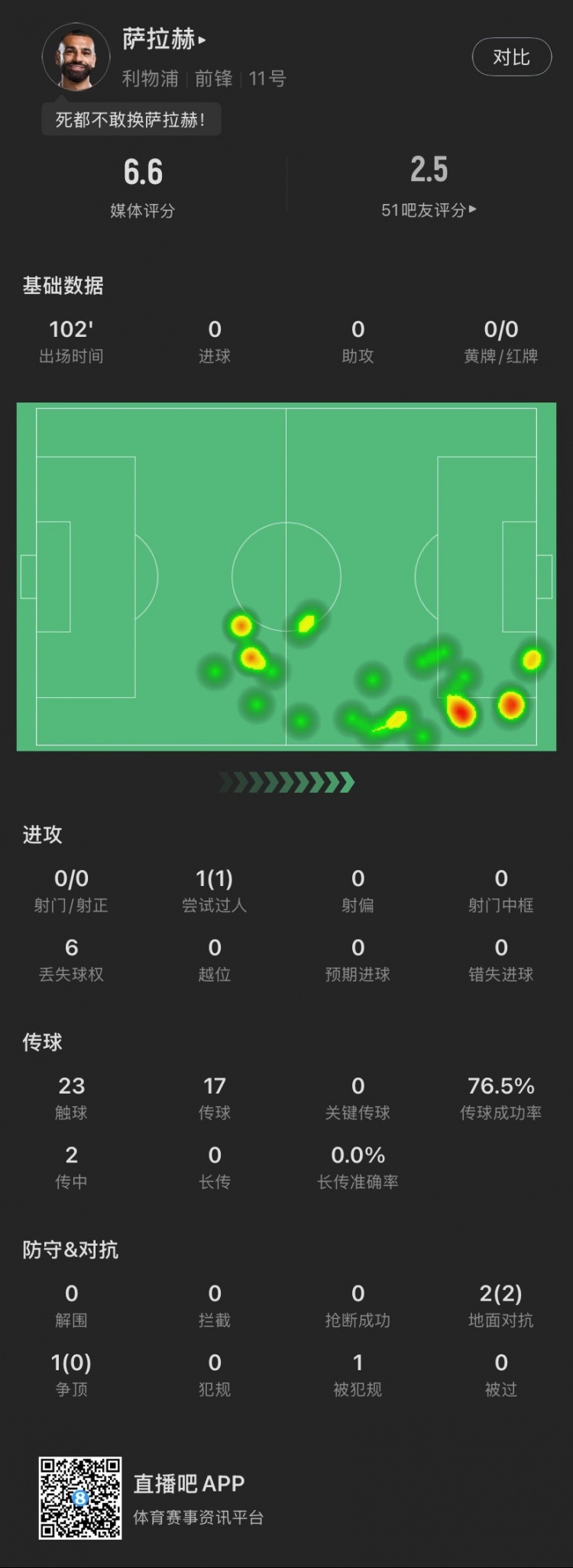 疑似上場!薩拉赫本場:0射門,傳球成功率76.5%,1過人,獲6.6分?