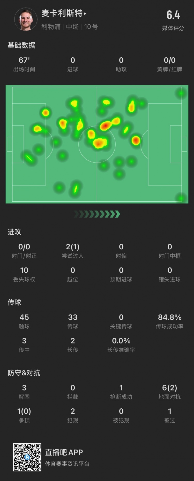麥卡本場:7次對抗成功2次,貢獻3解圍1搶斷,2犯規,僅獲評6.4分?