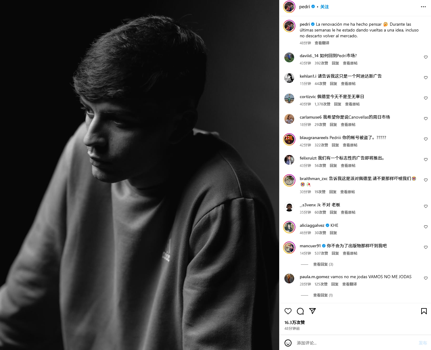 佩德里的配圖為他身穿阿迪達斯外套的照片,不少球迷認為這應該是贊助商廣告的預熱帖。