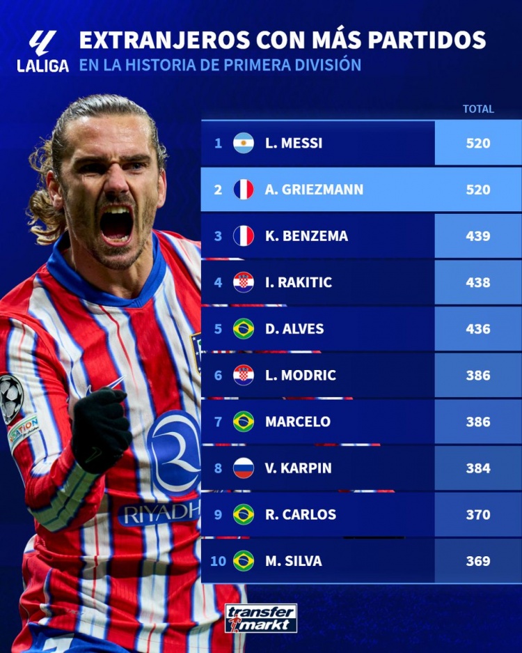 據德國轉會市場統計,此役過后,格列茲曼已出戰520場西甲比賽,與梅西并列排名西甲歷史外援出場榜首位。