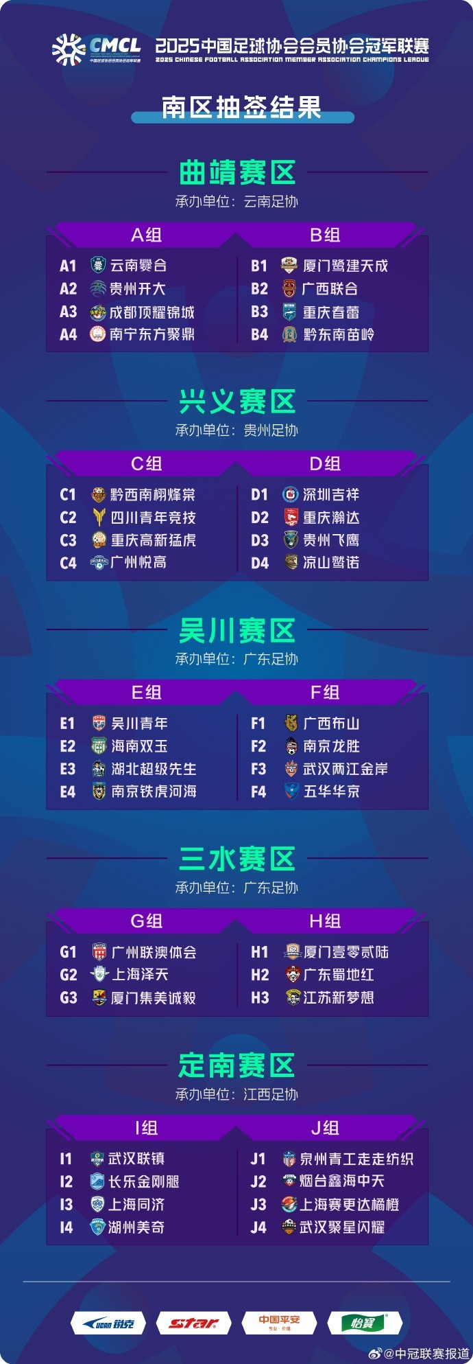 3月17日訊 2025賽季中冠聯(lián)賽南區(qū)抽簽結(jié)果出爐,本賽季中冠南區(qū)分5個賽區(qū)進(jìn)行,每個賽區(qū)分2組,共計(jì)38支球隊(duì)參賽。