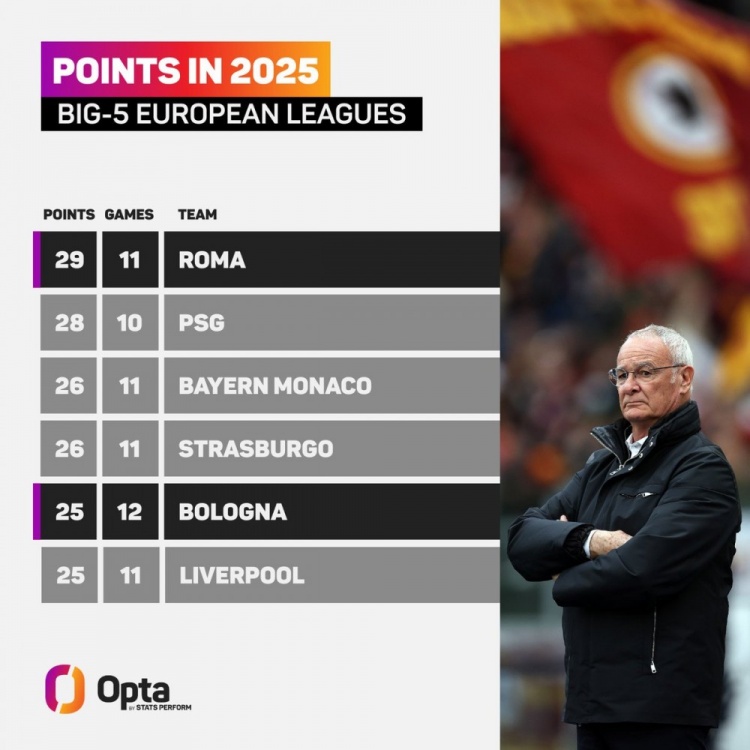 3月18日訊 國家隊比賽周來襲,五大聯賽暫時告一段落,OPTA也統計了2025年五大聯賽拿分情況,羅馬居首。