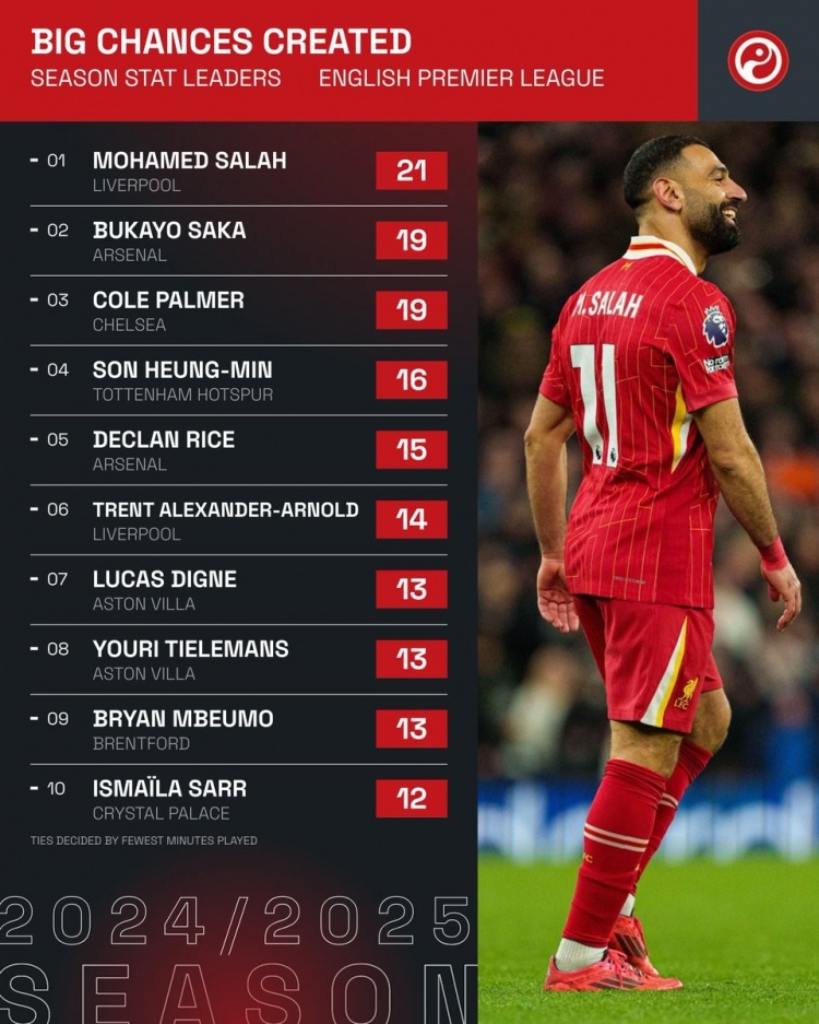 本賽季英超創造重大機會榜:薩拉赫21次居首,薩卡&帕爾默19次?