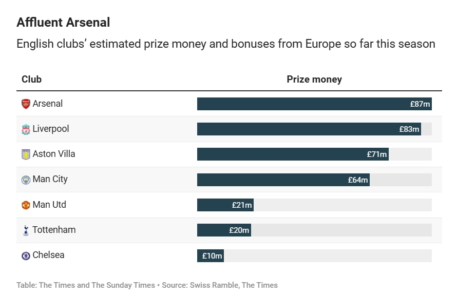 賽季至今英超球隊(duì)歐戰(zhàn)收入榜:阿森納8700萬居首&切爾西1000萬第7?