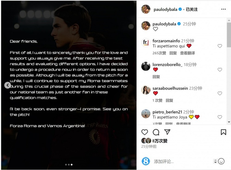 迪巴拉社媒:評估選擇之后決定接受手術,將為羅馬和阿根廷隊加油?