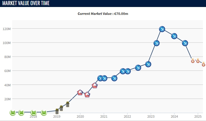 03月20日訊 德轉(zhuǎn)今日更新了土超球員身價,本賽季租借至加拉塔薩雷的奧斯梅恩身價再次下跌500萬歐,目前身價7000萬歐。