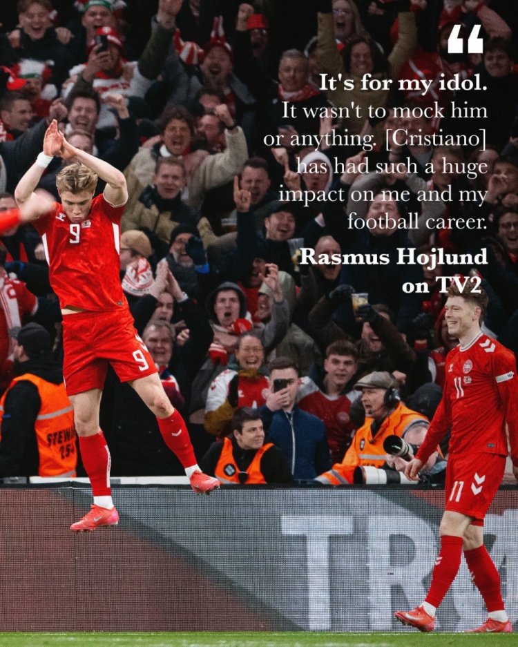 3月21日訊 歐國聯1/4決賽首回合中,丹麥1-0擊敗葡萄牙,霍伊倫破門后模仿了C羅標志性的Siu慶祝動作。