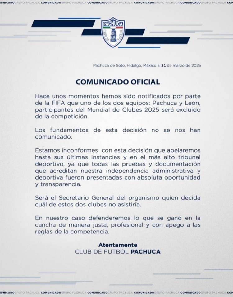 帕丘卡表示,國際足聯已通知兩支墨西哥球隊(帕丘卡和萊昂)中的一支將被排除在2025年世俱杯之外,但未向俱樂部說明具體理由。對此決定,帕丘卡俱樂部表示不滿,并計劃上訴至最高體育法庭。