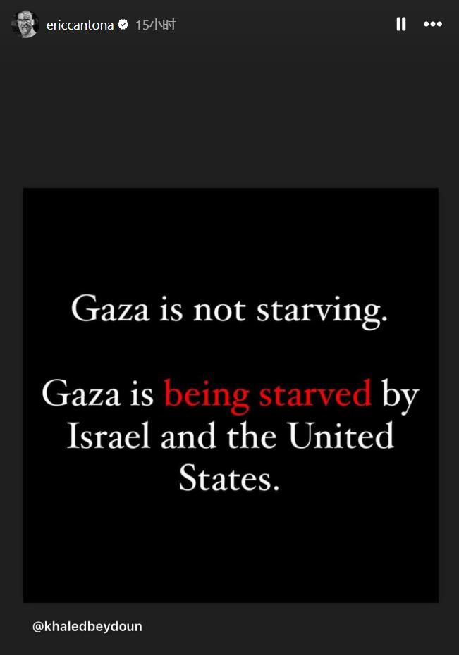 03月21日訊 前曼聯(lián)球星坎通納在社媒轉(zhuǎn)發(fā)快拍,聲援加沙民眾。快拍內(nèi)容:“加沙沒(méi)有陷入饑荒 是以色列和美國(guó)想餓死加沙”