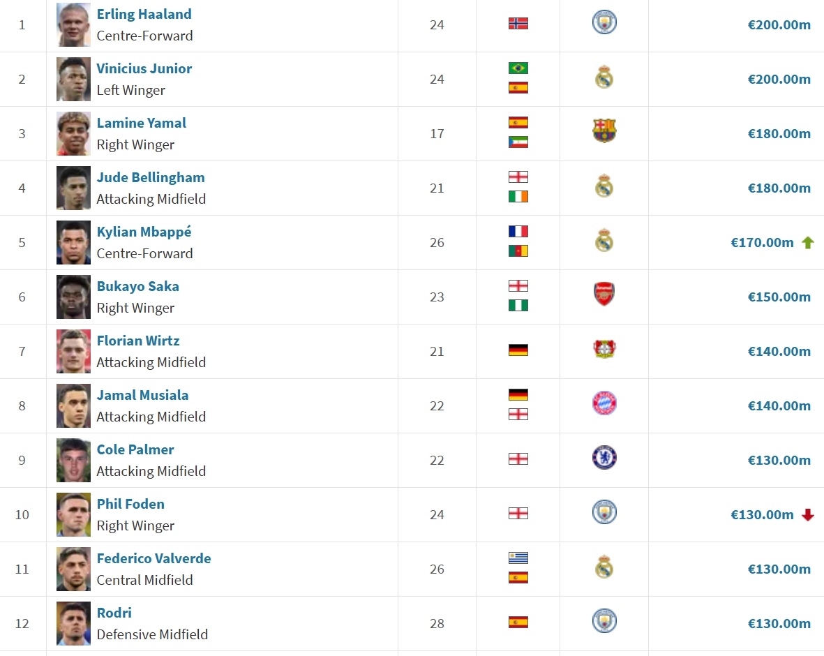 合理嗎?世界前十身價:哈蘭德&維尼修斯2億第1,福登1.3億仍前10?