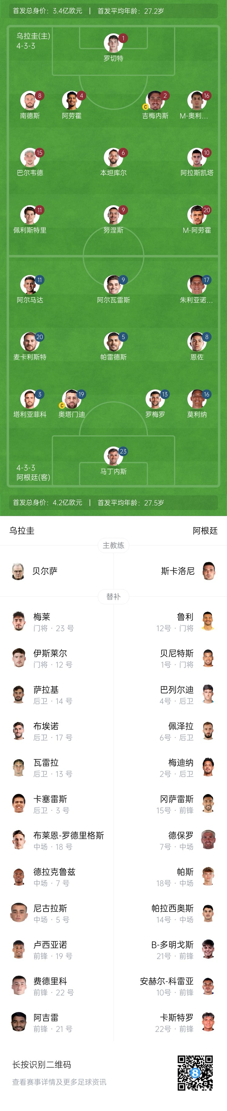 03月22日訊 世預賽南美區第13輪,阿根廷客戰烏拉圭,賽前首發公布。