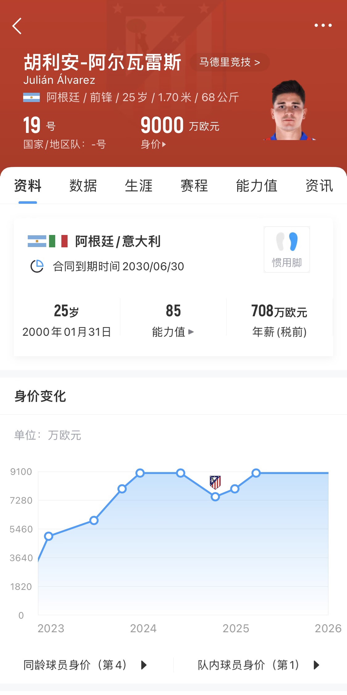 03月22日訊 昨日德轉(zhuǎn)更新西甲球員身價,阿爾瓦雷斯的身價重新回到9000萬歐,但沒有破億。